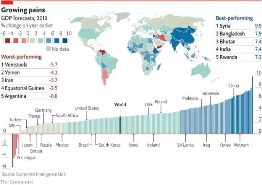 L’Eiu prevede che gli Stati Uniti avranno una crescita del Pil del 2,3% nel 2019 (e addirittura dell’1,3% nel 2020), in discesa rispetto al tasso stimato per lo scorso anno (del 2,9%) anche per le ripercussioni della politica monetaria della Federal Reserve sull’economia americana, oltre che per le scelte di chiusura del mercato interno; mentre la Cina dovrebbe attestarsi su una crescita pur sempre consistente, del 6,3% nel 2019 e del 6,1% nel 2020, ma in calo rispetto alla performance del 2018 (6,6%), a causa della guerra commerciale con gli Usa e dell’iniziativa interna per arginare il debito.
