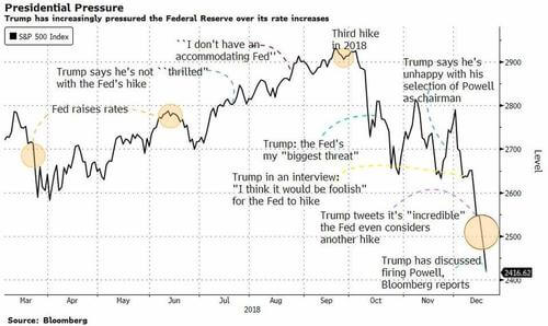 E attenzione, perché doppi fini a parte, Donald Trump ha ragione ad attaccare la Fed: non tanto nel merito, quanto nel tempismo del suo agire. Non si alzano i tassi in quel modo, conoscendo la natura fallace e dopata di quella che viene spacciata prima per ripresa record e poi addirittura per boom dell’economia. A meno che non si voglia creare un incidente ad hoc, nel qual caso di sta agendo in maniera esemplare. E il Presidente, ovviamente recitando un copione ben scritto, ha cominciato a dirlo ben prima che iniziassero i crolli di mercato, quando ancora Wall Street era il regno degli unicorni, come ci mostra questo grafico. Un capolavoro di mistificazione globale e un raro esempio di cortina fumogena a rilascio e infittimento graduale, davvero roba che Orwell se la sogna.