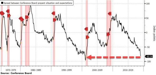 E quella che ha osservato Jerome Powell nei giorni che hanno anticipato la riunione del Comitato monetario (Fomc) è stata decisamente dura: il dato della fiducia dei consumatori reso noto il 29 gennaio parlava della peggior lettura dal 2011, il tutto in un Paese la cui economia si basa al 70% proprio sui consumi. Ma, peggio ancora, la sottocategoria hope, ovvero la speranza di trovare più disponibilità di posti di lavoro nei sei mesi successivi, è precipitata al 14.7 dal 22.7, il peggior calo a due mesi dal 1968. In una nazione che festeggiava fino all’autunno il miracolo occupazionale. E non basta, perché l’indice delle aspettative del Conference Board negli ultimi tre mesi è calato di un volume sempre associato nei recenti precedenti storici a periodi di recessione ufficiale, tanto che l’attuale spread fra condizioni attuali e aspettative è quello che segnala la maggior divaricazione addirittura dal marzo del 2001, come mostra il grafico.