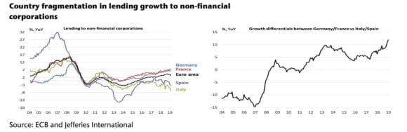 E c’è poco da stare allegri, perché siamo già oggi in modalità di conclamata Europa “a due velocità”. Il primo grafico ci mostra la differenza di impiego dei capitali da parte delle banche europee in fatto di acquisto e detenzione di titoli di Stato: quelle tedesche, ad esempio, nel 2018 hanno scaricato carta sovrana per un controvalore di 100 miliardi di euro, portando la percentuale di detenzione rispetto agli assets totali solo al 3,2%. In Italia, come si vede, il più volte citato doom loop non solo è vivo e vegeto, ma ormai qualcosa di strutturale: le nostre banche sono prestatori di ultima istanza del Tesoro, occorre parlare chiaro. Come, d’altronde, ha fatto – un po’ tardivamente – il governatore di Bankitalia, Ignazio Visco, proprio a poche ore dall’annuncio di nuove Tltro da parte della Bce. Cosa faranno, ora? Continueranno a comprare, operando in tandem con l’Eurotower e il suo piano di reinvestimento dei titoli in portafoglio, di fatto il vero scudo anti-spread che ci vede tranquillamente a quota 240, nonostante dati macro tutt’altro che da applausi? Il secondo grafico, purtroppo, ci offre la risposta: lo spread nel livello di prestiti erogati alle imprese non finanziarie da parte delle banche tedesche e francesi rispetto a quelle italiane e spagnole giovedì scorso ha toccato il suo massimo record.