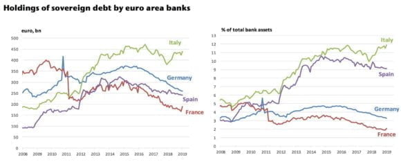 Cosa sta succedendo? Una prima, indiretta risposta l’ha offerta sempre venerdì il principale quotidiano belga, Le Soir, in un articolo dai toni parecchio allarmati: Bnp Paribas ha comunicato che entro il 2021 chiuderà 267 delle 678 filiali nel Paese, lasciando a casa qualcosa come oltre 2.200 lavoratori. Motivo? Digitalizzazione. Almeno formalmente. Perché stiamo parlando della chiusura di un terzo delle filiali, qualcosa che ha le sembianze di un piano di taglio dei costi a dir poco draconiano. Qualcosa che puzza molto di necessità stringenti, di conti che non tornano. Ed eccoci all’Italia e al mio timore, vista l’accelerazione del fidanzamento con la Cina e l’intervento forza quattro della Banca Asiatica per gli Investimenti, veicoli solitamente non messo in campo per operazioni di partnership ordinarie. A fungere da cinghia di trasmissione fra panico latente alla Bce e “geopolitica della disperazione” italiana ci pensano questi due grafici, appena pubblicati da Jefferies nel suo ultimo report riguardante l’eurozona.