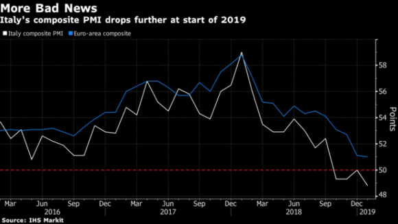 Primo, questo grafico ci mostra il livello di allarme cui è giunta la nostra economia: l’indice PMI manifatturiero dell’Italia, infatti, si è semplicemente inabissato, scendendo a 48.8 contro le attese di 49.4 e il livello sopra quota 50 dell’ultima rilevazione. E quella quota, ormai lo sapete, demarca l’espansione dalla contrazione economica. E noi siamo in contrazione, molto peggio di quanto previsto da Eurostat e da Bloomberg. Siamo nei guai. Quindi, occorrono alleanze e non crociate patetiche come quelle poste in essere dal ministro Savona con la sua politeia per cambiare la governance dell’Ue: di fatto, era come preoccuparsi del colore della moquette in una casa che va a fuoco.