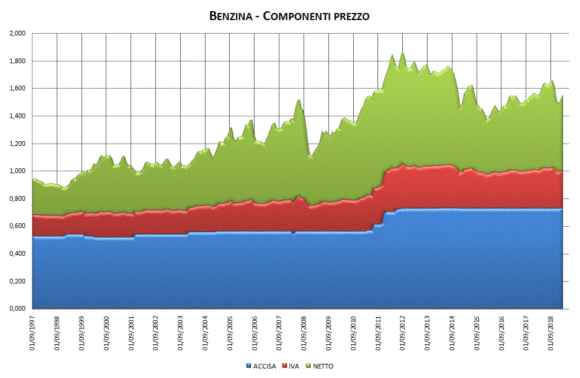 Estremizzando l’analisi, e impiegando i cosiddetti “macro-trend”, si può evidenziare: il prezzo del barile – dal novembre 1998 al giugno 2008 – è passato da 9,6716 a 88,8776 euro. Nel medesimo periodo, il corrispondente valore del nostro carburante è cresciuto da 8.976,40 a 15.121,30 euro (€/1.000 litri). Un ulteriore raffronto (sempre al rialzo) si ha con l’incremento tra il dicembre 2008 e il febbraio 2012: l’”oro nero” è partito da quota 31,9164 arrivando fino a 80,3708 euro. Di segno identico, ma di entità ben diversa, è quanto accaduto alla nostra benzina: da 11.208,8 a 17.378 euro (€/1.000 litri). Ultima e “più recente” rilevazione è quella intercorsa tra il febbraio 2016 e il settembre 2018. Il barile ha più che raddoppiato i propri prezzi passando da 31,0459 a 63,103 euro rispetto al nostro carburante che ha visto lievitare i suoi corsi da 13.781,8 a 16.422 euro.