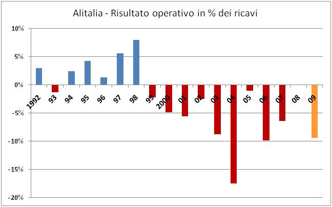 Se invece il confronto col triennio 2005-07 viene fatto in relazione al risultato della gestione operativa (che include i proventi e costi industriali, ma non gli oneri finanziari e le imposte), il dato della nuova azienda è identico in valore assoluto alla vecchia e decisamente peggiore in rapporto al fatturato: la nuova Alitalia ha infatti registrato nel 2009 un risultato operativo pari a -274 milioni a fronte di un dato medio di -274,8 della vecchia azienda nel triennio 2005-07; in rapporto al fatturato il risultato negativo della vecchia Alitalia era pari al 5,7%, quello della nuova al 9,4%.