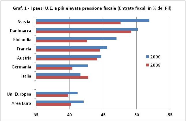 L’Italia ha una pressione fiscale più elevata di tre punti percentuali rispetto all’insieme degli altri paesi che adottano l’euro e di circa tre punti e mezzo rispetto all’insieme di tutti gli altri paesi dell’Unione Europea. Valori di pressione fiscale più elevati rispetto all’Italia sono presenti in Europa solo in alcune democrazie nordiche (Danimarca e Svezia) e in Francia e Austria, paesi caratterizzati da sistemi di welfare molto estesi ed efficienti e amministrazioni pubbliche ineccepibili. Peraltro gli stati che all’inizio del decennio avevano una pressione fiscale superiore a quella italiana (oltre ai precedenti anche la Finlandia e la Germania), hanno provveduto a ridurla sensibilmente.