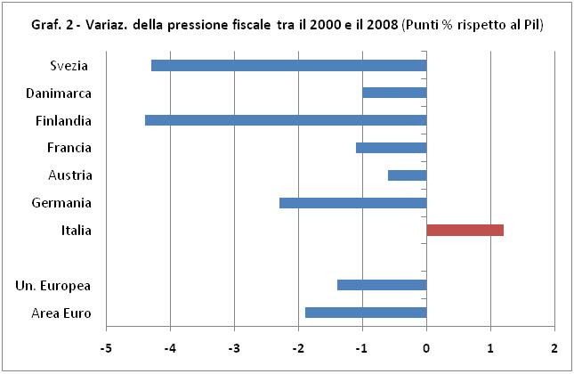 Come è possibile osservare dal grafico della pagina precedente, sembra essersi verificato una sorta di “pentimento fiscale”, dato che i paesi a più elevata pressione nel 2000, come Svezia e Finlandia, sono quelli che l’hanno ridotta in maniera più consistente. Inoltre Germania e Finlandia, che nel 2000 avevano una pressione fiscale maggiore della nostra, nel 2008 la hanno ricondotta al di sotto di quella italiana.
