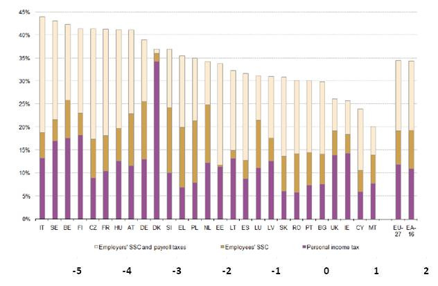 Sommando i contributi sociali all’imposta personale sul reddito da lavoro e rapportando il prelievo complessivo da parte del sistema fiscale al costo del lavoro sostenuto dalle imprese, otteniamo una misura di sintesi del carico fiscale che, illustrata nel grafico sottostante, pone l’Italia al primo posto tra i 27 paesi dell’Unione Europea.
