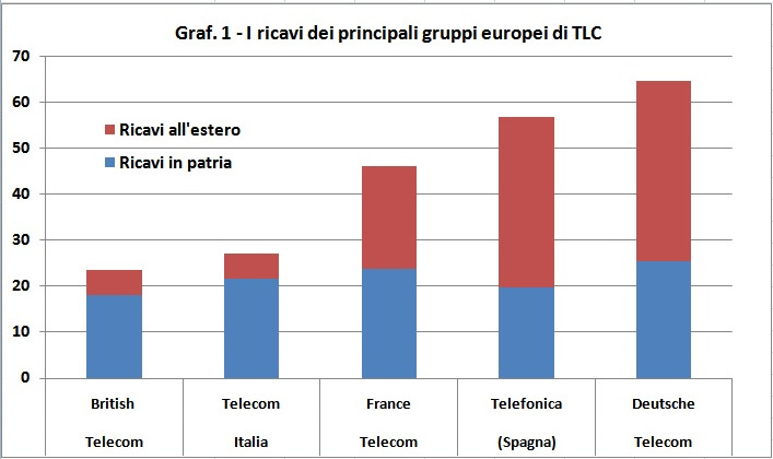 Tra i cinque grandi ex monopolisti Telecom Italia fa parte, assieme a British Telecom, del sottogruppo dei più “piccoli” (tra 20 e 30 miliardi annui di ricavi) e dei meno internazionalizzati (l’81% dei ricavi telefonici sono realizzati in Italia; il dato per British è del 77%).