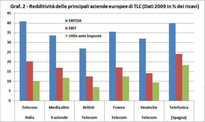 A) la redditività industriale di Telecom Italia è maggiore della media delle altre quattro imprese; infatti (tabella 1 e grafico 2) l’Ebitda (margine operativo al lordo degli ammortamenti) in rapporto ai ricavi è stato nel 2009 del 41%, il valore più elevato tra le cinque aziende messe a raffronto (il dato medio delle altre quattro è stato invece del 34%), mentre l’Ebit (risultato operativo dopo gli ammortamenti) si è attestato al 20%, il secondo miglior risultato tre le cinque imprese dopo Telefonica (il dato medio delle altre quattro è stato invece del 17%);
