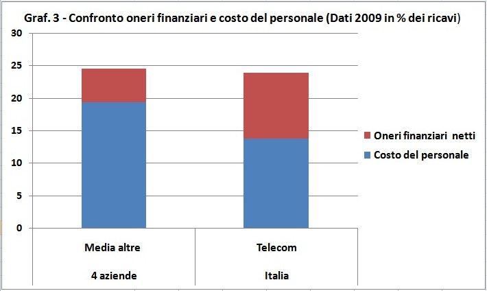 La somma delle due voci in rapporto ai ricavi è infatti molto simile nelle diverse realtà considerate: nella media delle quattro aziende straniere raggiunge il 24,6% dei ricavi, mentre in Telecom Italia il 23,9%; tuttavia nelle altre quattro aziende la parte del leone è giocata dal costo del lavoro col 19,4%, mentre gli oneri finanziari netti si limitano al 5,2%; in Telecom Italia invece il costo del lavoro è pari solo al 13,7% dei ricavi, cinque punti e mezzo in meno, mentre gli oneri finanziari netti raggiungono il 10,2%, cinque punti percentuali in più.