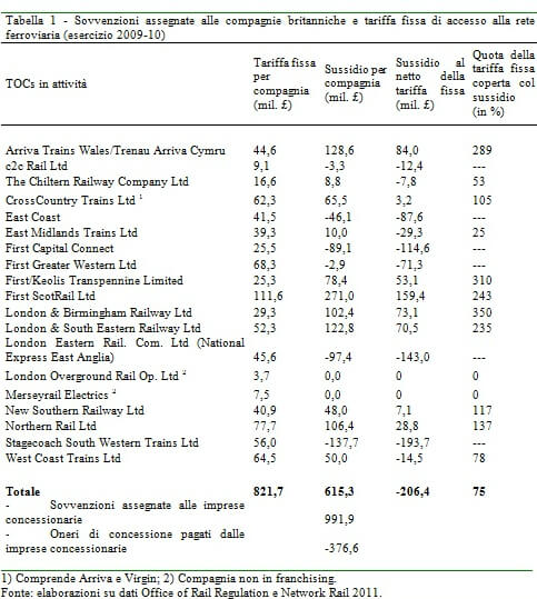 Nel 2009 le compagnie hanno ricevuto 615 milioni di sovvenzioni nette, ma hanno pagato 822 milioni di tariffa fissa al gestore della rete. Il sussidio totale al netto della tariffa fissa è dunque negativo per 206 milioni. Questi dati dimostrano che le compagnie ferroviarie britanniche sono in grado, nel loro insieme, di coprire tutti i loro costi operativi, comprese le tariffe variabili di uso della rete.