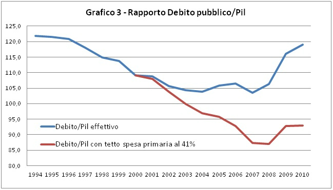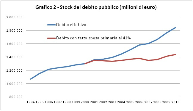 Nel decennio 2000 il debito pubblico sarebbe rimasto stabile poco al di sotto dei 1400 miliardi, per superare tale valore, ma di poco, solo in conseguenza della crisi economica. A fine 2010, il minor debito pubblico accumulato è stimabile in circa 400 miliardi: 1440 miliardi a fronte di circa 1840 miliardi effettivi.