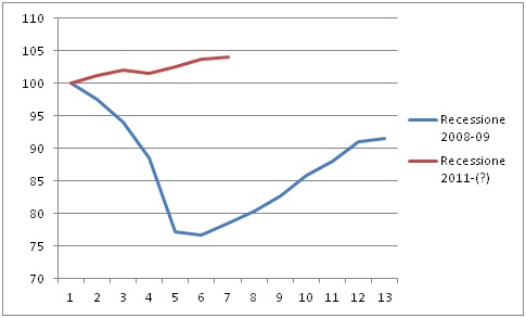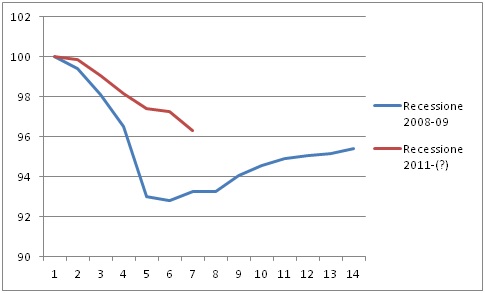 Lo possiamo comprendere meglio esaminando i grafici seguenti, i quali mettono a confronto la recessione in corso, iniziata nel terzo trimestre 2011, con quella drammatica del biennio 2008-09. Il primo di essi riguarda proprio la dinamica del Pil reale: il suo valore livello trimestrale è stato posto uguale a 100 sia nel primo trimestre 2008, sia nel secondo trimestre 2011 (trimestri zero nel grafico 1), dato che è a partire da questi due periodi che è iniziata la discesa, evidenziata dalla linea blu per la recessione del 2008-09 e dalla linea rossa per la recessione in corso. Come si può osservare quella attuale è nel suo complesso meno intensa, tuttavia più duratura.