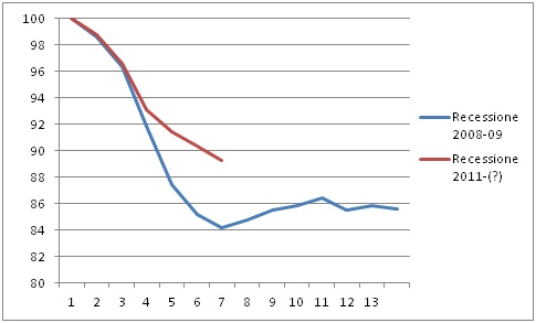 Lo possiamo comprendere meglio esaminando i grafici seguenti, i quali mettono a confronto la recessione in corso, iniziata nel terzo trimestre 2011, con quella drammatica del biennio 2008-09. Il primo di essi riguarda proprio la dinamica del Pil reale: il suo valore livello trimestrale è stato posto uguale a 100 sia nel primo trimestre 2008, sia nel secondo trimestre 2011 (trimestri zero nel grafico 1), dato che è a partire da questi due periodi che è iniziata la discesa, evidenziata dalla linea blu per la recessione del 2008-09 e dalla linea rossa per la recessione in corso. Come si può osservare quella attuale è nel suo complesso meno intensa, tuttavia più duratura.
