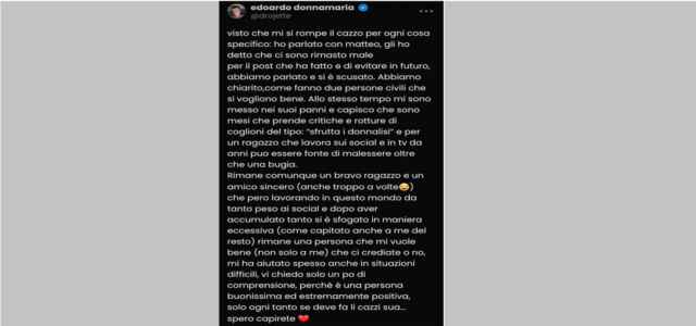 Parole dure quelle di Matteo Diamante che hanno scatenato la reazione dei fan dei Donnalisi e dello stesso Edoardo Donnamaria che, a distanza di pochi giorni, su Hive, ha pubblicato il lungo sfogo ammettendo di esserci rimasto male e di aver avuto un confronto chiarificatore con Diamante. “Visto che mi si rompe il cazz* per ogni cosa specifico: ho parlato con Matteo, gli ho detto che ci sono rimasto male per il post che ha fatto e di evitare in futuro. Abbiamo parlato e si è scusato. Abbiamo chiarito, come fanno due persone civili che si vogliono bene. Allo stesso tempo mi sono messo nei suoi panni e capisco che sono mesi che prende critiche e rotture di coglion* del tipo: “sfrutta i donnalisi” e per un ragazzo che lavora sui social e in tv da anni può essere fonte di malessere oltre che una bugia”, ha scritto lo speaker radiofonico.