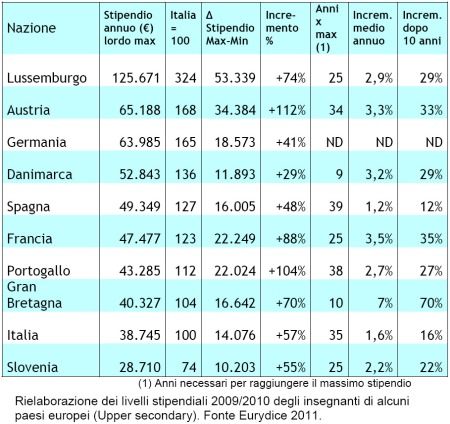 Considerando che nel nostro Paese, se si esclude la recente sperimentazione realizzata con il progetto “Valorizza” (un una tantum per merito a pochi docenti), le progressioni di stipendio sono legate all’anzianità di servizio e operano ogni sei anni (fatto salvo il recente “blocco degli scatti” disposto in Italia che ha allungato ope legis questo tempo), e ricavando qualche indicatore dai pochi dati considerati, ci si accorge che le possibilità di migliorare, anche solo sul piano economico, la propria condizione professionale sono – per un insegnante italiano – limitate a un +16% dopo 10 anni e sono, inoltre, assolutamente indipendenti dal merito e dai risultati. Un abisso rispetto a Paesi dove si può arrivare a incrementi notevolmente superiori ma soprattutto dove sono possibili accelerazioni nei tempi dovute a migliori competenze, merito e risultati.