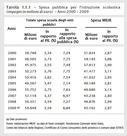 Certamente, in questi ultimi anni abbiamo assistito ad una progressiva contrazione delle risorse pubbliche a tutti i livelli, e la scuola non fa eccezione. E’ anche vero che le risorse per l’ampliamento dell’offerta formativa (legate alla L. 440/97) sono diminuite sensibilmente in quest’ultimo decennio (dai 269,2 milioni di euro del 2001 agli 87.872.477,00 dell’E.F. 2011, con un taglio del 70%), e che effettivamente le scuole si trovano in difficoltà nella gestione dei servizi e nella realizzazione delle attività aggiuntive. Occorre però precisare che il nostro Paese spende ancora oggi per l’Istruzione statale ingenti risorse (oltre 50 miliardi di euro!) e che il calo si è registrato soprattutto in rapporto al totale della spesa pubblica (vd. tabella del Miur, “La scuola in cifre”, 2011).