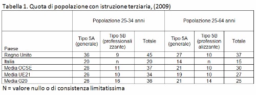 Peccato che le cose non stiano così. Nella classificazione internazionale i programmi post-secondari di tipo professionalizzante vengono inclusi nella categoria della formazione terziaria di tipo “5B”, mentre quelli di tipo generalista vengono inclusi nella categoria “5A”. Anche a prescindere dai limiti della classificazione Isced, che esclude dal computo dei corsi professionalizzanti alcuni indirizzi di studio di primo livello somministrati in Italia, che andrebbero inclusi nella categoria 5B (per esempio le lauree nelle professioni sanitarie sono invece comprese nella categoria 5A), come risulta dalla tabella 1 tratta dalla pubblicazione Ocse “Education at a Glance” del 2011, il confronto è impietoso, non solo con la media dei paesi Ocse, europei e ai G20, ma anche con il Regno Unito. Nell’ambito dei corsi di tipo “5A” il Regno Unito ha una quota quasi  doppia di laureati sia nella classe d’età 25-34 anni sia in quella 25-64 anni.