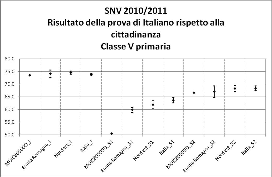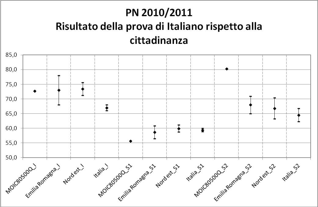 Come si può osservare in entrambi i grafici gli studenti di origine italiana (I) hanno risultati del tutto simili ai loro compagni della regione (Emilia Romagna), della macro-area (Nord-Est) e dell’Italia; gli alunni stranieri di seconda generazione (S2) hanno risultati un po’ inferiori rispetto ai loro compagni, ma del tutto simili a quelli regionali che è bene ricordare che ha percentuali di alunni immigrati dimezzate rispetto al nostro istituto. Inoltre alla fine del primo ciclo di istruzione questi alunni hanno risultati superiori ai loro compagni italiani autoctoni e ai compagni della regione. A onor del vero questo potrebbe essere un dato non del tutto significativo perché il numero di alunni di 13-14 anni, nati in Italia da genitori immigrati è ancora piuttosto ridotto nelle nostre classi, tuttavia rappresenta un segnale positivo: la scuola ha consentito a questi studenti, in genere piuttosto motivati, di superare l’ostacolo dell’origine, in altre parole ha svolto il suo compito.
