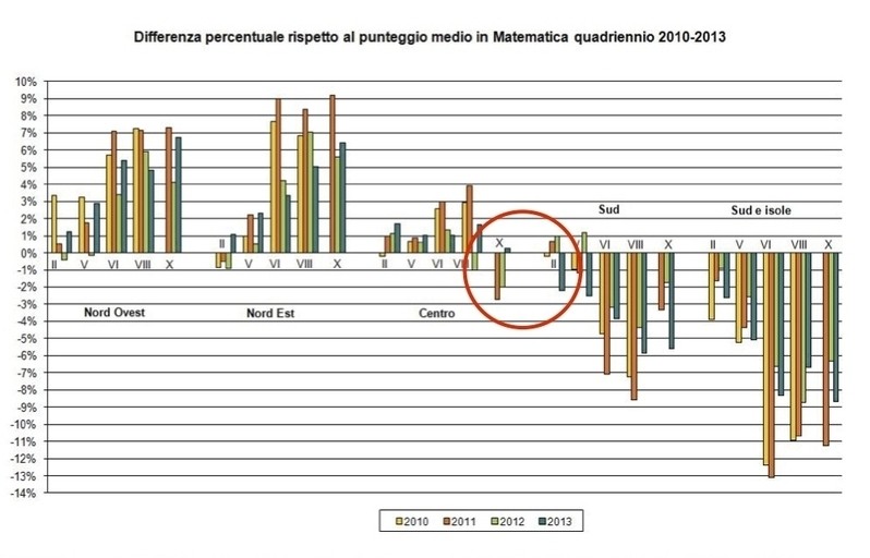 Visto dall’esterno, un dato che potrebbe significare una utilità in sé delle rilevazioni è un’inversione di tendenza, che si registra per esempio in matematica nel 2013 nella macro-area del Centro nei livelli 8 e soprattutto 10 (PN e II superiore): segno che invertire una tendenza si può (v. il caso della Puglia) e che quindi c’è del lavoro da fare.