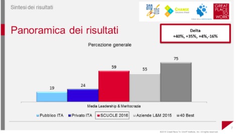 I dati sono abbastanza sorprendenti, in quanto smentiscono la vulgata comune che vede le scuole secondarie caratterizzate da bassi livelli di efficienza e meritocrazia, mentre le colloca addirittura al livello delle migliori aziende italiane, che come abbiamo scritto più volte sono generalmente meno brave delle multinazionali.