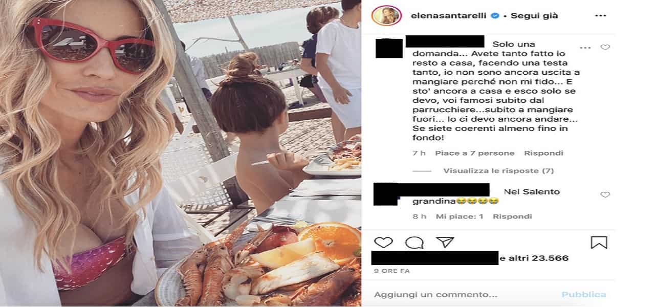 Elena Santarelli nella bufera. La showgirl, su Instagram, ha pubblicato la foto di un pranzo al mare scatenando i duri commenti di alcuni followers. La Santarelli, insieme alla figlia Greta, alla vigilia della Festa della Repubblica, si è concessa un pranzo al mare a base di crostacei. Nella foto, la Santarelli indossa un bikini e si mostra sorridente. Nella didascalia si legge: “1/06/2020 #lunchwithmybabygirl”. La foto, dunque, è stata scattata il primo giorno di giugno scatenando i commenti duri di alcuni utenti che hanno esortato la showgirl ad essere più coerente. “Solo una domanda… Avete tanto fatto io resto a casa, facendo una testa tanta, io non sono ancora uscita a mangiare perché non mi fido… E sto a casa e esco solo se devo, voi famosi subito dal parrucchiere, subito a mangiare fuori… Io ci devo ancora andare… Se siete coerenti almeno fino in fondo”, ha scritto una follower.
