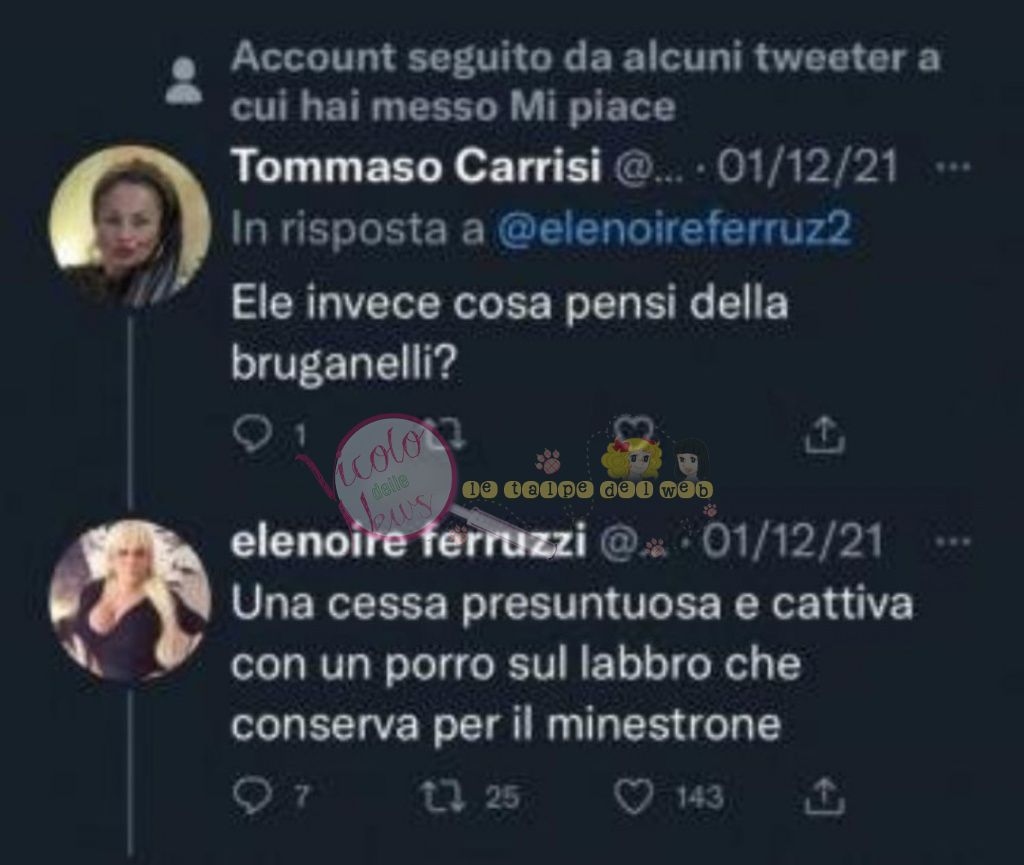 Le talpe del Vicolo delle News, infatti, sui social, hanno pescato dei commenti fatti da Elenoire durante il Grande Fratello Vip 6. Come potete leggere qui, l’opinione della Ferruzzi sulla Bruganelli fa pensare a futuri scontri tra le due. “Una ces*a presuntuosa e cattiva con un porro sul labbro che conserva per il minestrone”, scrive la Ferruzzi.