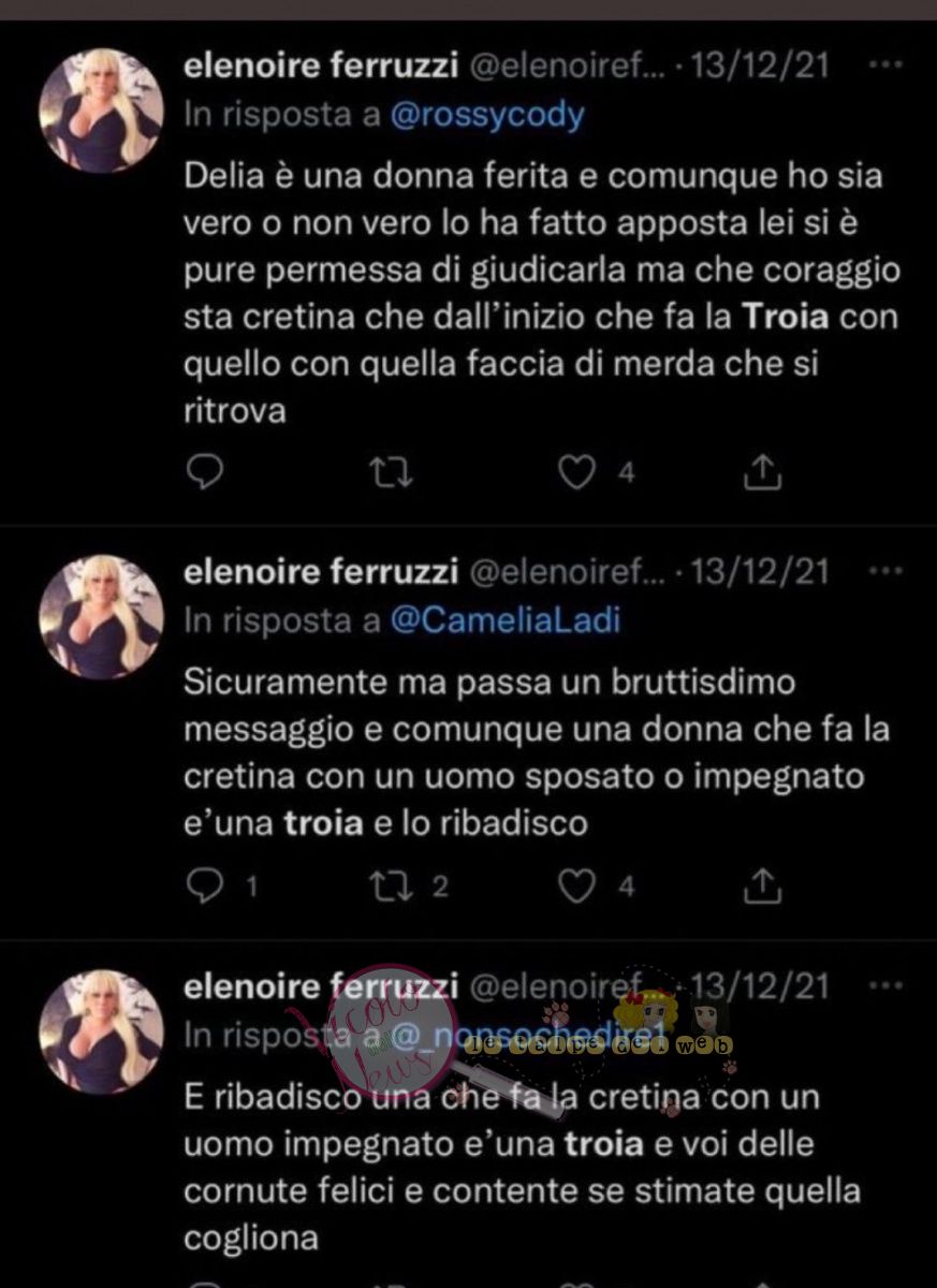 Come si intuisce da ciò che hanno scritto le talpe del Vicolo delle News, Elenoire Ferruzzi ha seguito tutta la scorsa edizione del Grande Fratello Vip lasciandosi andare anche a commenti sul triangolo formato da Delia Duran, Alex Belli e Soleil Sorge. Nei confronti di quest’ultima che, con l’inizio della settima stagione condurrà il GF Vip Party insieme a Pierpaolo Pretelli, non è mai stata tenerissima. “Delia è una donna ferita e comunque sia vero o non vero lo ha fatto apposta, lei si è pure permessa di giudicarla ma che coraggio sta cretina che dall’inizio che fa la Tro*a con quello con quella faccia di mer*a che si ritrova“, aveva scritto in un primo commento che potete leggere cliccando qui.