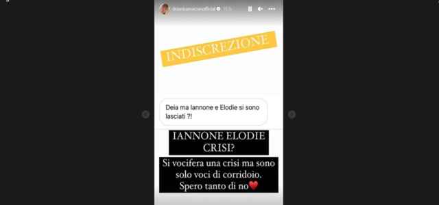 “Iannone ed Elodie in crisi? Si vocifera una crisi ma sono solo voci di corridoio. Spero tanto di no”, ha scritto Deianira. La coppia che sta insieme da un anno e che ha scelto di vivere in Svizzera, sarà realmente in crisi? I fan si augurano di no.