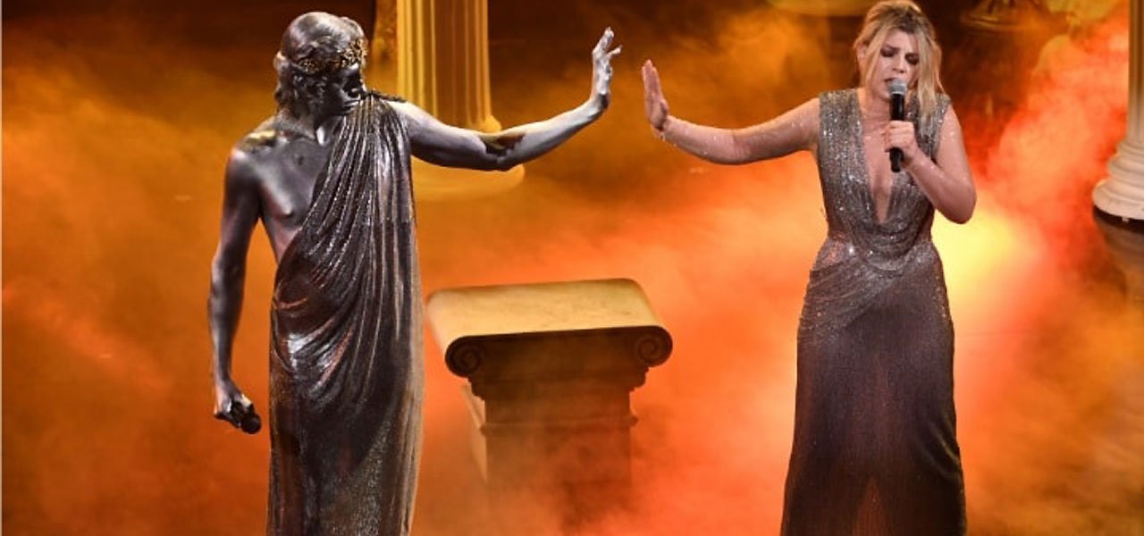 Nella serata di ieri, come detto, il nuovo quadro vivente di Achille Lauro ha visto la partecipazione proprio di Emma, col sapiente tocco dell’attrice Monica Guerritore, in una riproposizione in chiave moderna della figura di Penelope. “Un omaggio agli incompresi” ha spiegato poi il veronese Lauro De Marinis che ha riportato il pubblico da casa nelle atmosfere dell’Odissea trasformandosi in una statua greca dorata con tanto di ramoscelli e circondato da colonne mentre, sulle note dell’omonima canzone “Penelope” di Emma, la Guerritore vestiva i panni proprio di quella che nella mitologia è “una donna senza voce” e che nessuno ascolta, costretta ad attendere il proprio uomo per oltre 20 anni. “Un bacio enorme ad Achille Lauro per avermi regalato una grande emozione!” ha poi scritto Emma sui social, parlando di un sogno che si realizzava.