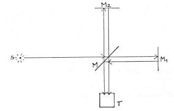 L’interferometro di Michelson (immagine qui sotto a sinistra) è composto da una lamina M semitrasparente, posta a 45° rispetto alla direzione della luce incidente, e da due specchi M1 e M2, in direzione perpendicolare come in figura, e alla stessa distanza l rispetto al centro della lamina.