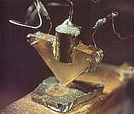[A sinistra: Il transistore a contatto (a baffo di gatto) realizzato nel 1947 da Bardeen e Brattain (Bell Labs)]