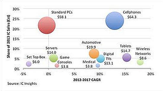 Il grafico precedente riporta sulle ordinate la quota percentuale del mercato totale dei semiconduttori che compete a ciascun settore applicativo. L’asse delle ascisse mostra la crescita percentuale annua prevista nel quinquennio 2012-2017, mentre il raggio dei cerchi è proporzionale al valore del fatturato annuo, riportato anche in cifre, del singolo settore applicativo.