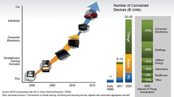 Il grafico che segue mostra lo sviluppo delle connessioni alla rete. I primi terminali di connessione alla rete sono stati i PC, fisicamente collegati via cavo, poi sono arrivati tutti gli strumenti portatili, connessi attraverso la rete wireless, e ora sono entrati in gioco una varietà di oggetti come elettrodomestici, apparati legati alla gestione e la sicurezza degli edifici, le forniture di energia, gas e acqua, le automobili…