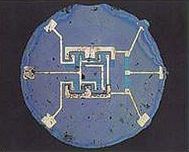 A destra è riportato il primo circuito integrato su germanio realizzato da Kilby nei laboratori della Texas Instruments; per questo dispositivo, nel 2000, è stato assegnato a Kilby il premio Nobel per la fisica.