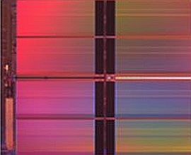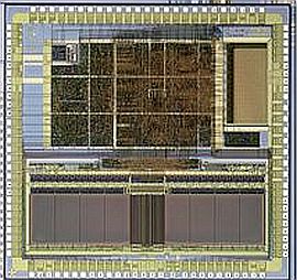 A destra è riportato un circuito integrato realizzato nella fine degli anni ’90 in tecnologia C\MOS da 0,25mm (STMicroelectronics) che, meglio dei processori odierni, permette di identificare chiaramente regioni del chip con aspetto differente.
