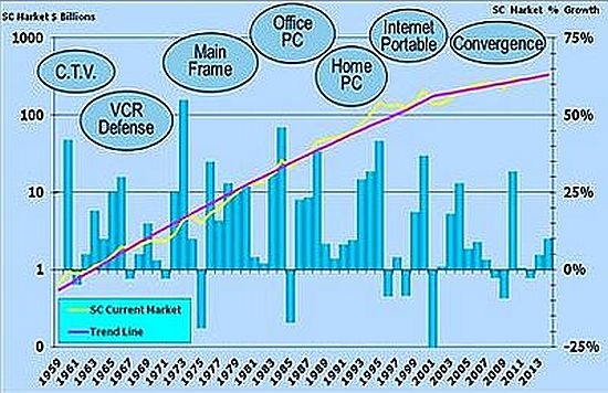 Se si trascurano le oscillazioni legate alla variabilità ciclica tipica di un mercato di componenti, il fatturato della microelettronica è cresciuto a un ritmo costante del 15% annuo per quarant’anni; a partire dal 2001 il tasso di crescita si è ridotto, non solo per effetto del rallentamento dall’economia globale, ma soprattutto perché il fatturato dei semiconduttori non poteva continuare a crescere indefinitamente a un ritmo superiore al mercato globale dell’elettronica, di cui rappresenta una parte.