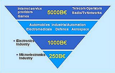 Se consideriamo anche il mercato dei prodotti finali, come l’automobile, gli elettrodomestici, i sistemi elettromedicali, l’automazione industriale e tutta l’area dei servizi legati alla rete e alle telecomunicazioni, possiamo dire che il valore economico complessivo di tutto ciò che dipende dalla microelettronica è di circa 5000 miliardi di euro.