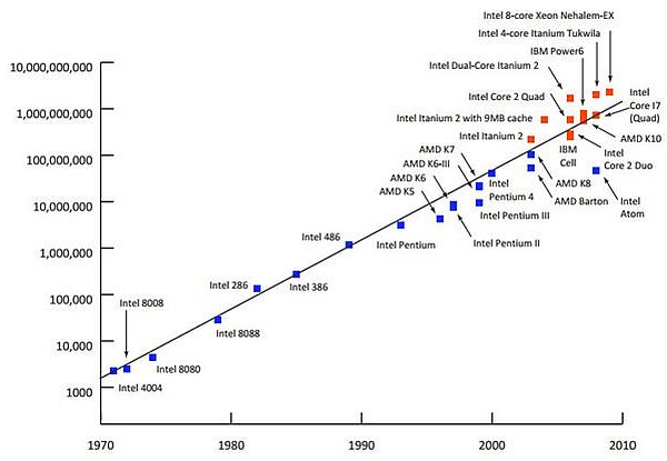 Il grafico che segue riporta, per diverse famiglie di processori, il numero di transistori integrati nel chip in funzione dell’anno di fabbricazione: la scala delle ordinate è logaritmica e il fatto che i dati tendano a disporsi lungo una linea retta significa che, per 40 anni, la crescita del numero di transitor per chip è stata esponenziale.
