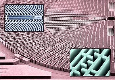 Si possono realizzare oggetti come quello mostrato nell’immagine che segue, che è anche molto apprezzabile dal punto di vista estetico. E’ un esempio di sensore inerziale, in cui ci sono due parti interdigitate, una fissa e l’altra sospesa; in presenza di una accelerazione angolare, la distanza relativa tra le due parti si modifica a causa dell’inerzia della parte sospesa. La variazione dalla distanza tra le due parti può essere rilevata misurando la capacità elettrica della struttura. In questo modo si realizza un sensore di rotazione.