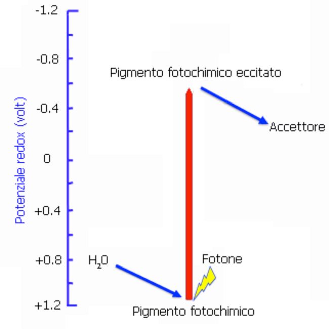 Fotosintesi ossigenica. Quando il pigmento fotochimico, in seguito alla ricezione di un fotone si eccita e poi cede un elettrone a un accettore, la sua forma ossidata deve ricevere un elettrone perché la fotochimica possa ripetersi. Se il donatore di questo elettrone è l’acqua (4 volte da 2 molecole di H2O), viene rilasciato O2