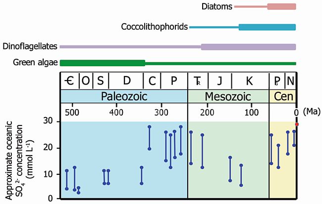I produttori primari che da questo momento divennero prevalenti negli oceani possedevano cloroplasti con una composizione elementale più adatta a una vita in ambienti molto ossigenati (ovvero con maggiore abbondanza dei metalli più disponibili in ambienti ossici) e avevano un maggiore contenuto cellulare di S, elemento la cui concentrazione oceanica, contestualmente, aumentò in modo rilevante (si veda l’immagine che segue per le variazioni del solfato negli oceani).