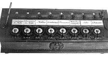 [Immagine a sinistra: Calcolatore di Pascal (1642). I numeri vengono introdotti utilizzando le ruote metalliche in primo piano; la soluzione appare nelle finestrelle visibili in secondo piano]