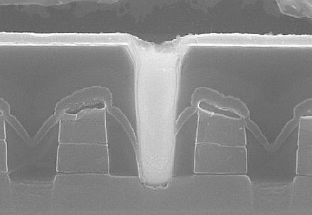 Fotografia al microscopio elettronico della sezione di una memoria flash realizzata in tecnologia da 150 nm