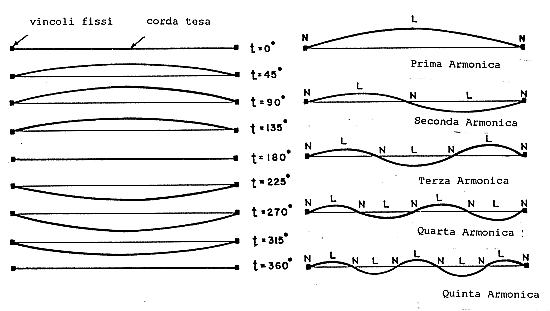 A destra: la stessa corda tesa oscillante anche in armoniche. N = nodo, L = ventre.