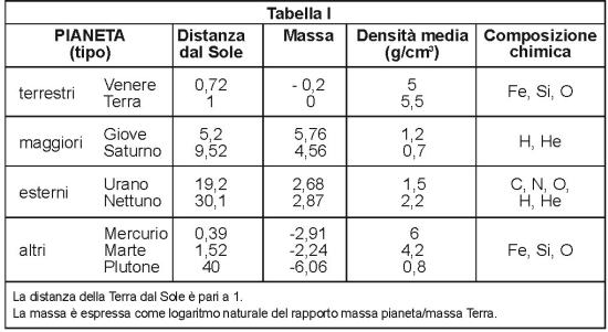 Vi è una chiara distinzione nella composizione chimica dei pianeti, cui corrisponde sia una diversa collocazione spaziale (rispetto al Sole) sia diversi valori di massa e densità medie (Tabella I).