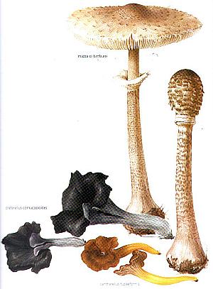 [A sinistra: Lepiota Procera e Craterellus Cornucopioides]