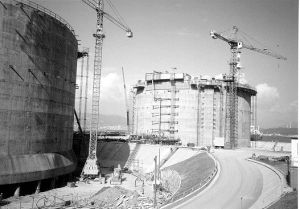 Questa percentuale è troppo modesta per consentire una diversificazione degli approvvigionamenti che metta al riparo da crisi temporanee o per consentire, in prospettiva, una politica di acquisto del gas in un maggior numero di aree di produzione. [Immagine a sinistra: strutture di adeguamento di due serbatoi per GLN a Panigaglia]