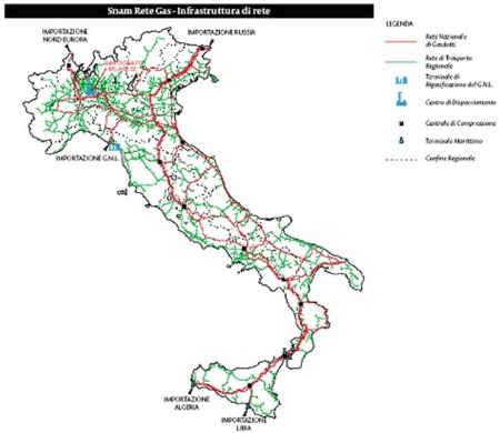 Gli ottanta miliardi di metri cubi di gas naturale che vengono distribuiti annualmente in Italia provengono per circa il 25% dai giacimenti nazionali e per la restante parte vengono importati attraverso i grandi gasdotti che arrivano dalla Russia, dal Nord Europa e dal Nord Africa. Per la precisione i punti di ingresso nel territorio nazionale di questi gasdotti sono cinque: a Nord-Est, Tarvisio e Gorizia (dalla Russia), a Nord, il passo Gries in val Formazza (dall’Olanda e dalla Norvegia), a Sud, Mazara del Vallo (dall’Algeria) e Gela (dalla Libia).