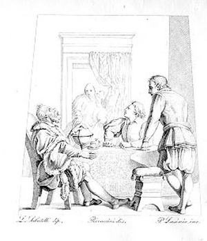 [A sinistra: Galileo cieco che detta le sue ultime dimostrazioni e scoperte meccaniche ai suoi diletti discepoli Torricelli e Viviani (incisione di Paolo Lasinio tratta dall’affresco di Luigi Sabatelli)]